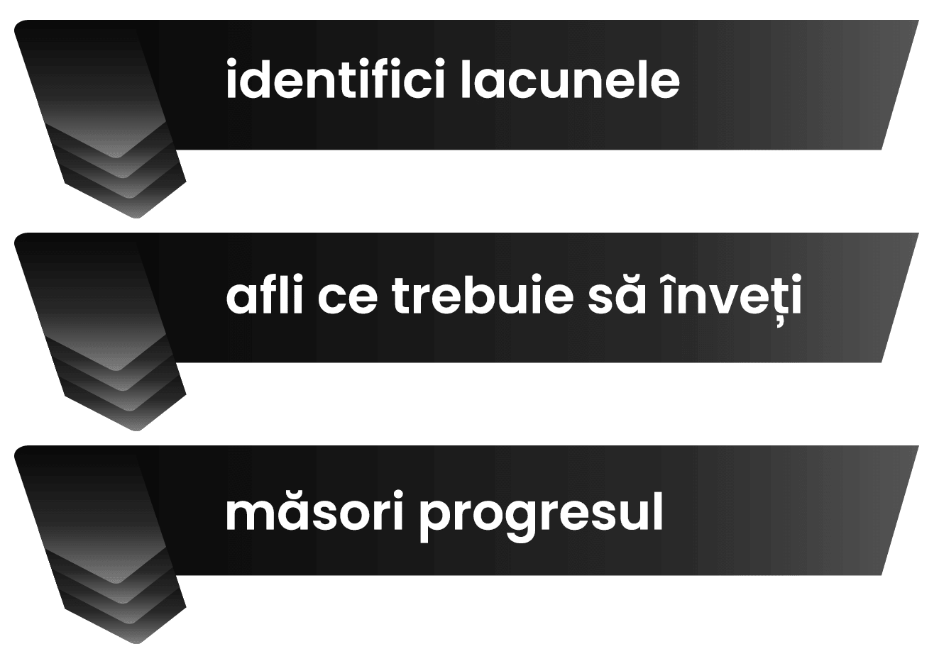• ​​Teste grilă prin care identificăm lacunele și iți recomandăm ce trebuie să înveți pentru a fi pus la punct